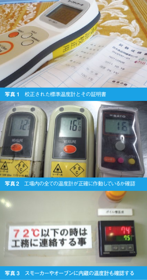 他にも、装置に固定されている温度計、例えばスモーカーやオープンに内臓されている温度計は、精度確認された携帯温度計を使って比較するか、装置によってはメンテナンスや点検時に行うものもある(写真3)