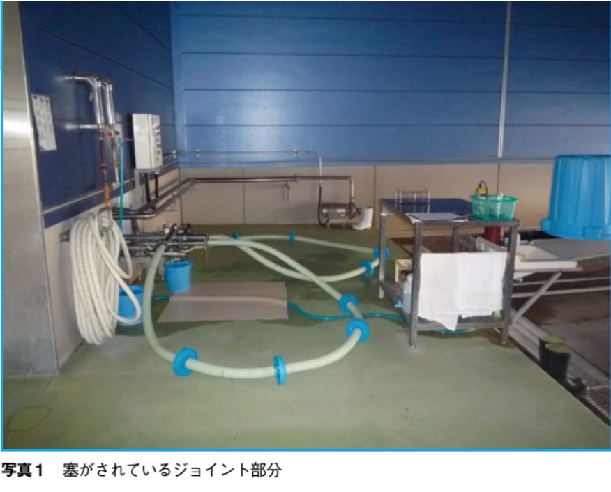 生乳の搬入口は、牛乳専用工場なら受け入れのためのパイプのジョイントがあるので、生乳以外を載せたローリーが入ってくるのでなければ識別され、ジョイント部分は塞がれている(写真1)。