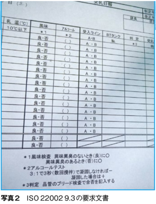 生乳は工場に到着したら、いきなりパイプを通して搬入するのではなく、サンプルを取り、20分ほどで分かる検査をし、問題なければ搬入する。これが9.3の次の要求文書である「そのようなシステムへの荷揚げは、受け入れ材料の承認及び検証の後にのみ実施しなければならない」になる(写真2)。