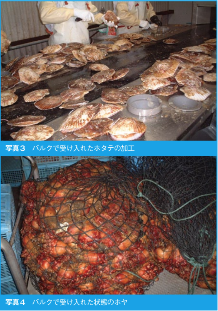 漁港や繁殖場から加工工場に運ばれる魚介類やバルク原材料になるものが多い。例えば、ホタテ、カキ、ホヤ、アサリやシジミなどの貝類、サンマ、イワシといった大量に船から水揚げされるもので、トラックそのまま、あるいは大型のコンテナで加工工場に搬入される(写真3,4)。