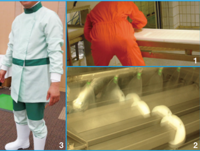 これを防ぐには、どのラインがアレルゲンを使っているかを明確にして、そこの従事者が他のラインに移動する際には、いったんラインから出て、作業衣を換え、再入場する。大型工場では、作業衣の色を変えると分かりやすい。又、汚れや微細粉が付きにくい無じん衣のユニフォームが良い(写真3)。