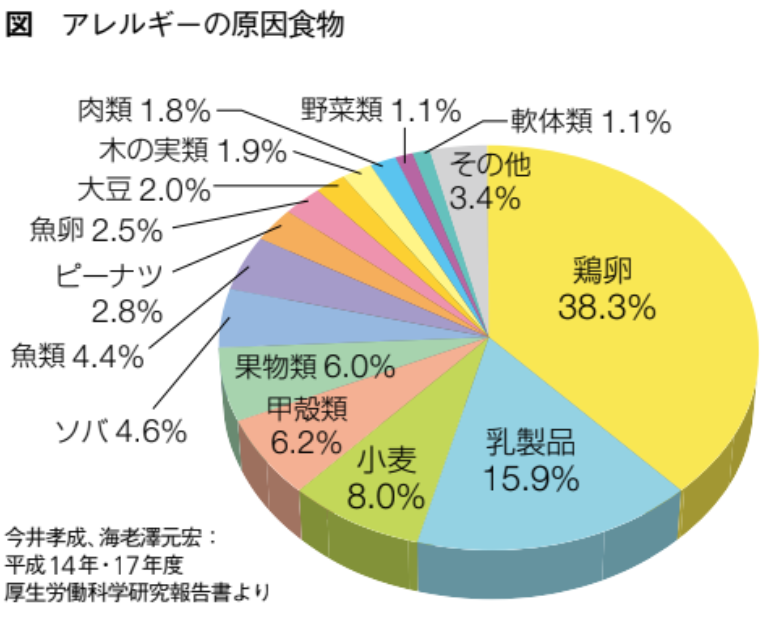 原材料と中間製品の置き場所が同じだと、接触による交差汚染になる。置き場所を分け、しっかりとゾーニングする必要がある。参考にアレルギーの原因食物を図に示す。