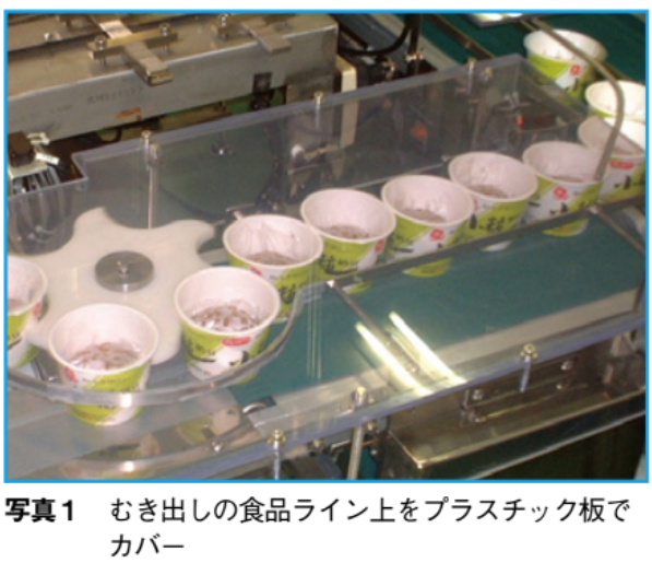 結露の元が天井裏の湿度が高いところである場合は、天井裏に除湿機を入れる。これができなければ、小型の扇風機を設置して風を当て、結露にならないように乾燥させてしまう。その上で、むき出しの食品ラインの上をカバーして落下物から保護する(写真1)。