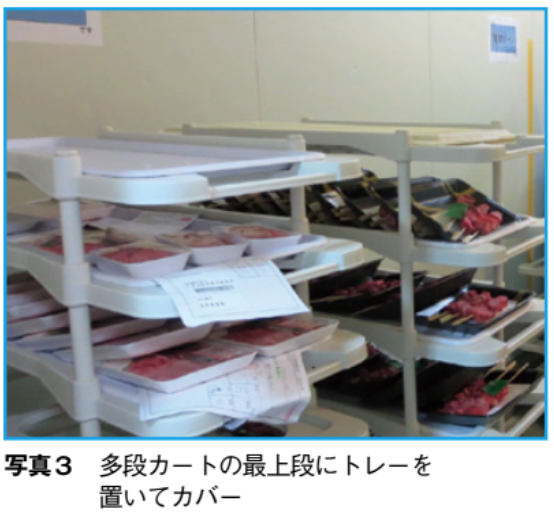 食肉のスライスパックを行なっている工場では、スライス後、パック待ちの肉を一時保管したり冷やし込む冷蔵庫に入れる場合、多段カートの最上段は使わず、カバー代わりにトレーを置いておく。これで上からの落下を防ぐことができる(写真3)。