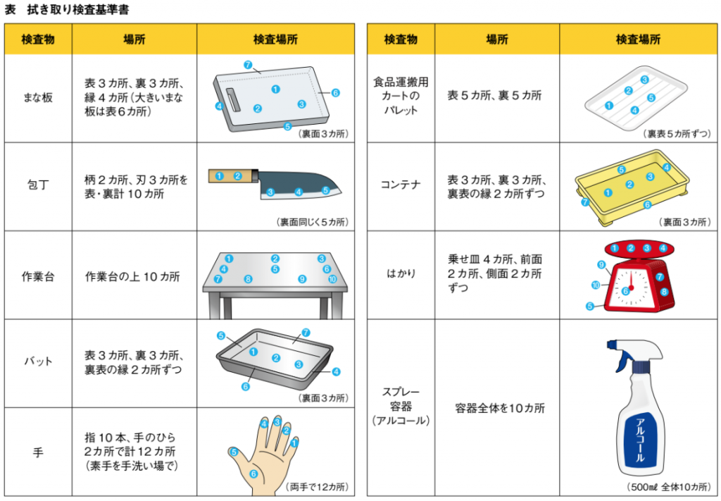 ある生鮮パックセンターでは、検査の対象と場所を、検査効果が高い方法で決めている。例えばナイフなどの製造道具なら、どこをどのように拭き取るかがマニュアルになっている(表)。その上で、数十本あるどのナイフを拭き取るかは、あっとランダムに決めている。こうすることで、検査効果が高まる。