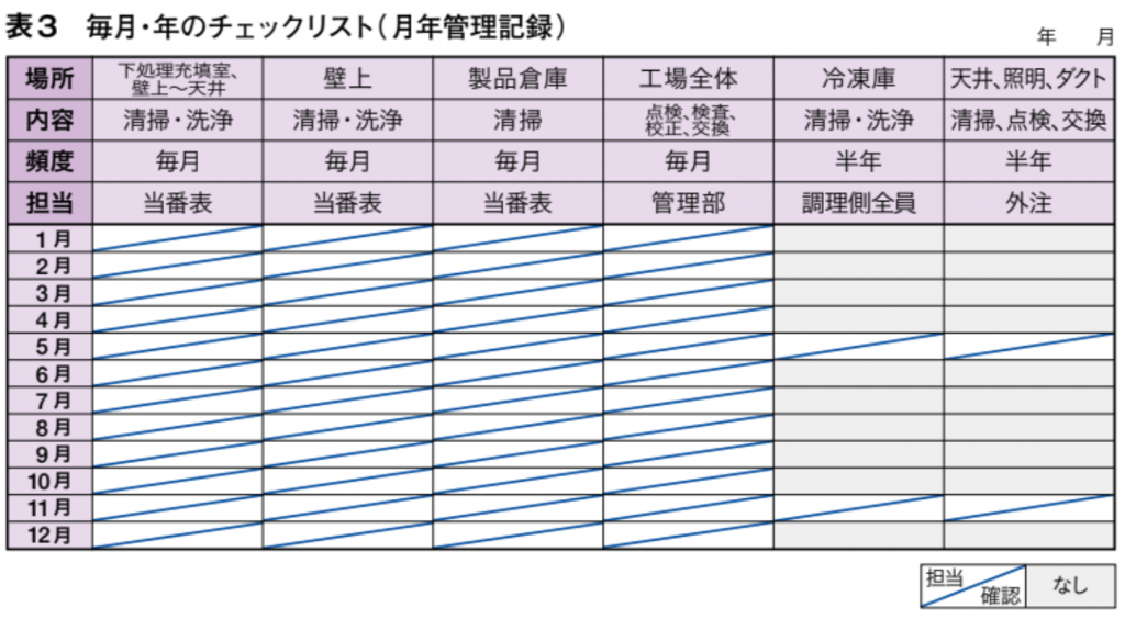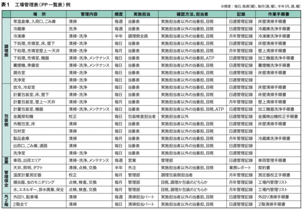 11.3の要求事項を具体的に整理すると、「内容、頻度、担当、確認、記録」の5項目になる。そこで、工場内全ての清掃・洗浄、メンテナンスの対象について、まずこの5項目のチェックリストを作成する。最も重要なのは頻度で、「毎日/毎週/毎月/年単位」のどれかに当てはめる(表1)。