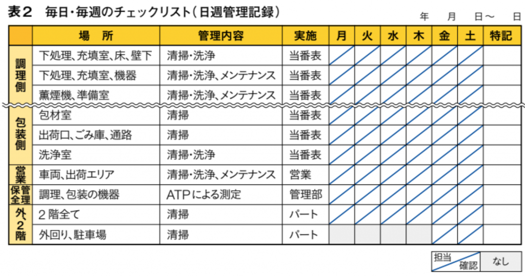 この最初の表を作ったら、今度は頻度を基に2つのチェックリストを作る。一つは「毎日・毎週のチェックリスト」(表2)で、これは毎週1枚使うが、e)清掃・洗浄後の点検とf)開始前の点検を別にするなら2枚になる。