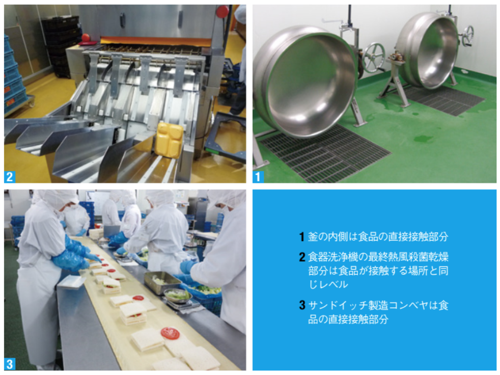 まず製造工程内の食品が接触触れている場所をリストアップし、図面にもプロットする。例えば、単に蒸煮鍋ではなく、蒸煮鍋の内側と縁、スライサーなら刃と食材タンク(あるいは台)というように、具体的に記述する(写真1・2・3)。