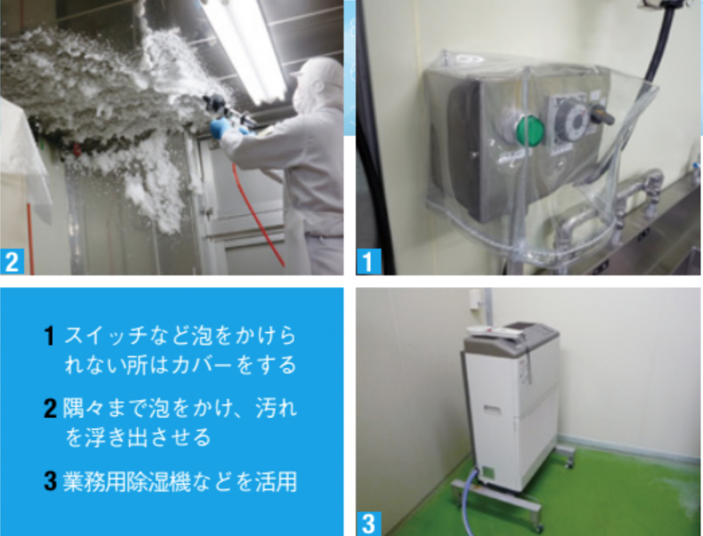 泡洗浄する場所、装置、エリアを決め、頻度を決める。床や装置は毎日だが、壁の腰位置から天井まで、天井、冷蔵庫内など、毎週、毎月、年などと頻度を決め、チェックリストを作る。運用しながら洗浄順序や方法、頻度などを改善していくと、どんどん効果的な洗浄にしていくことができる。
